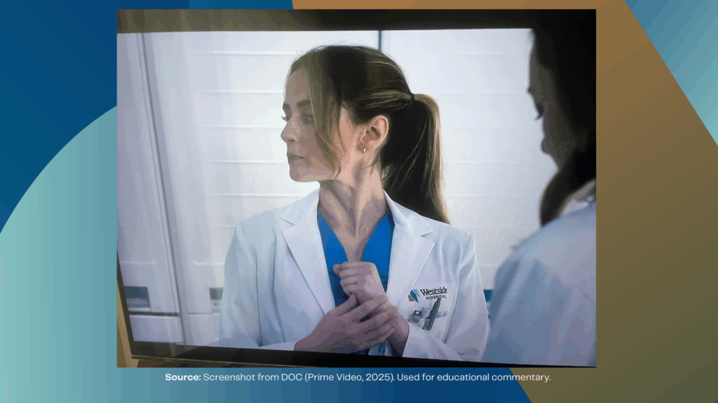 In a recent episode of DOC on Prime Video, Dr. Amy Larson, an experienced physician rebuilding her life after memory loss, checks in with Hannah, a visibly nervous new intern. Hannah is seen gently tapping on the side of hand acupressure point.